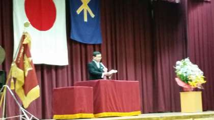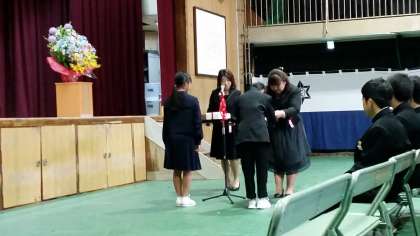 学校長式辞や生徒歓びの言葉に続き、PTAより記念品(シャープペンシル)を受け取りました。