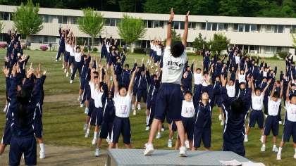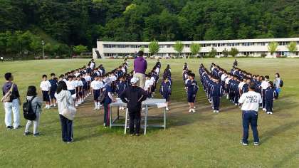 2日目の朝の集いです!みんなでラジオ体操を行い、身体を目覚めさせています。