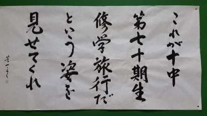 明日は、体育館にて荷物の確認作業。さらに係・体験・ファーム・バス座席等の最終確認。教室に戻り、担任より最終学活。11時55分頃、一斉下校の予定です。素晴らしく輝いた十三中学校3年生の姿を期待した奥野先生の書です。