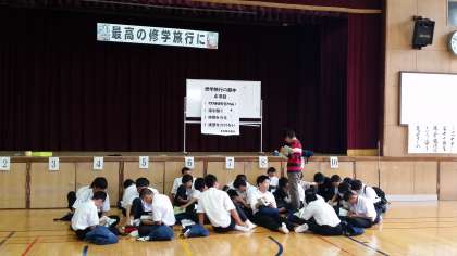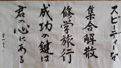 修学旅行の荷物や行程等の最終確認です。忘れ物もあり、帰宅後再登校して、荷造りを完遂する生徒もいます。『スピーディーな集合解散 修学旅行の成功の鍵は君の心にある』という書を奥野先生より頂戴しました。明日7時15分、集合完了です!君たちの心を信頼しています。