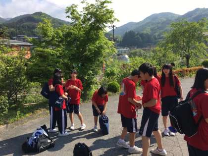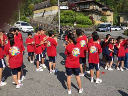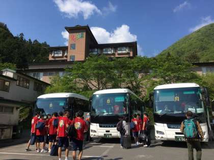 宿舎前にて集合写真撮影後、各体験会場へバスにて向かいます。爽やかな晴天に恵まれ、我が修学旅行にも天は味方してくれます。