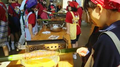 バームクーヘン作りの開始です。部屋に甘い美味しそうな香りが充満しています。焼き上がりが楽しみ!