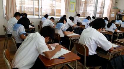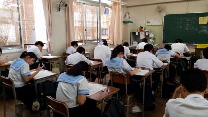 真剣にテスト問題に向き合っています。人間は努力する過程で大きく成長します。進路決定まで、奥野先生の書を肝に銘じましょう!