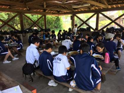 周囲にカレーの香りが漂い始め、カレーが完成しました。ご飯も炊きあがりました。成功です。それでは‥‥‥『いただきます!』