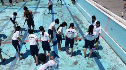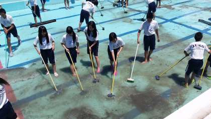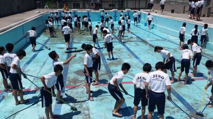 2年生と3年生がプール清掃を行いました。1年間の汚れを落として、気持ちよく水泳授業ができるように、“自分でできることは自分でする”という信条を実行しました。プール開きは6/8(木)の予定です。