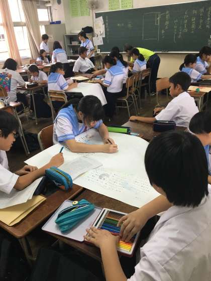 1年生が一泊移住の壁新聞を作成しています。果たして、仕上がり具合は‥‥‥。完成作品、期待してください。