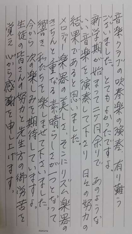 6/13(火)の『吹奏楽部inつばめ通り』の対する礼状が届きました。地域の皆様にたくさん拍手をいただき、本当に感謝の気持ちで一杯です。宝物として音楽室に掲示します。ありがとうございました。 吹奏楽部顧問・部員一同。