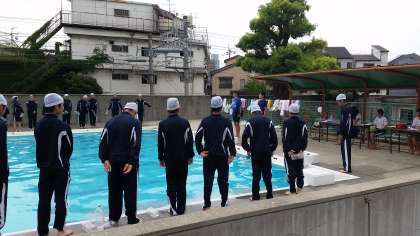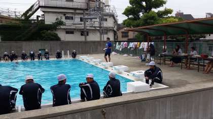 3年生が体育授業で着衣水泳を行いました。スイミングスクールのインストラクターによる指導のもと、服を着たまま水に浮く方法や溺れている人を助ける時の対応を学習しました。