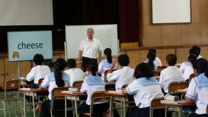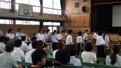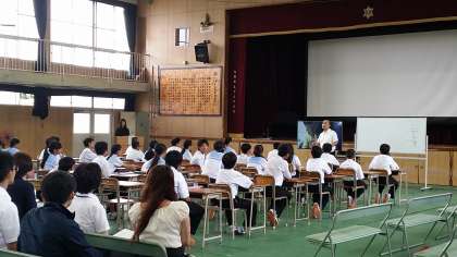 英語の授業研究会に1年4組の生徒が参加しました。普段とは違う体育館での授業で戸惑っている様子もありましたが、積極的に授業に参加してくれました。