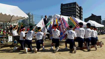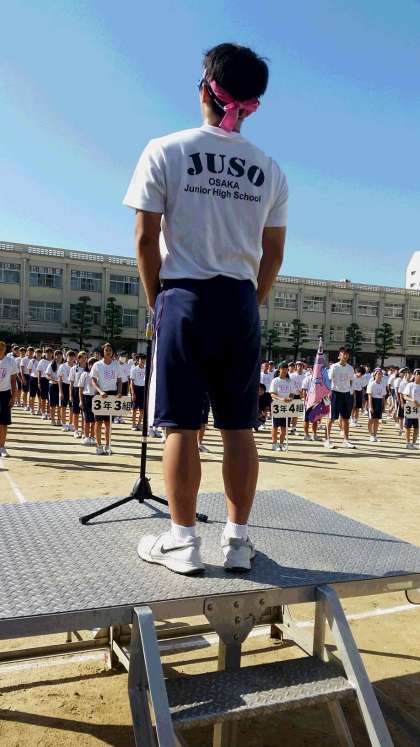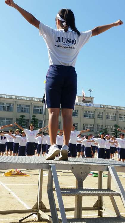 生徒会長による開会宣言。代表生徒の選手宣誓とラジオ体操、開会式は順調に進行しました。代表生徒、輝いていました!