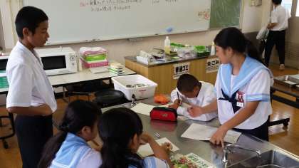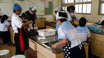 調理実習を班単位で振り返っています。豆腐ナゲットの出来具合はいかがでしたか。次回は調理中の生徒の様子をお届けします。