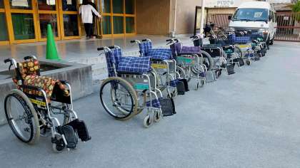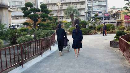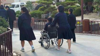 1年生が福祉体験学習を行いました。各クラス班ごとに車椅子体験をし、中学校敷地内のスロープや中庭等の段差を通過しました。「押す」「乗る」「声掛けをする」3つの役割を経験して、相手の立場に立って行動できる道徳的感性を養いました。