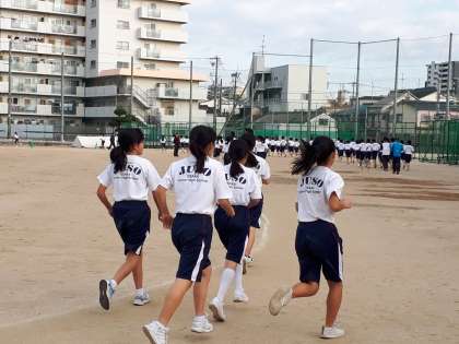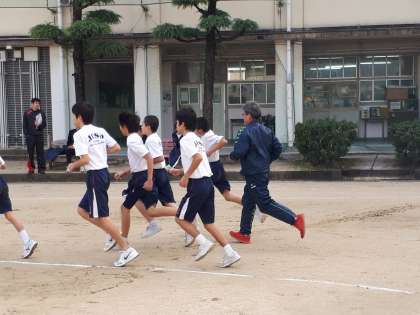 1年生は、マラソン大会の練習をい行いました。『72期生、走りたいんか?』という体育委員の掛け声に、全生徒で『走りたいんや!』と答えて20分間走がスタート。生徒の元気に触発された教員も走り出しました。マラソン大会は2/9(金)に淀川河川敷にて実施します。保護者の声援が、生徒の背中を押します。応援よろしくお願いいたします。