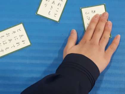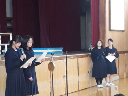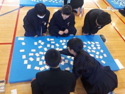 インフルエンザによる学級休業のため、延期していました百人一首大会を開催することができました。歌が詠まれる前の静寂と詠み始めた後の歓声。「静」と「動」のコントラスト。感動しました!次の合唱コンクールも期待しています。