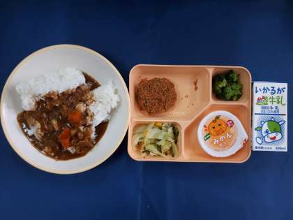 卒業祝い献立は、ポークカレーライス・ミンチカツ・キャベツとキュウリのサラダ・ミカンゼリーです。これからは自分で考えて食べる機会が増えてきます。好き嫌いをせず、栄養バランスの良い食事をとることを心掛けましょう!