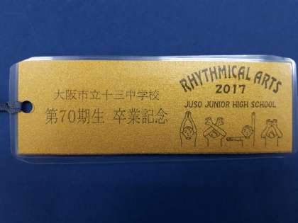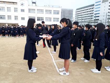 雨が心配されましたが、「歓送会がやりたいんや!」という全生徒の熱意で雨雲を退散させました。1.2年生の代表生徒が、3年生に心のこもった手製しおりを贈呈しました。デザインは、『リズミカルアート』。