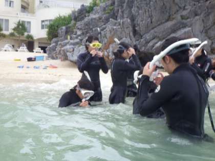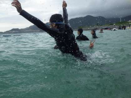 マリン体験の続き。シュノーケリングでは、午前中は海の中が見えたのですが、午後は波が荒く濁ってしまいました。でも荒い波もまた楽しい思い出です。