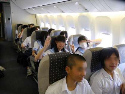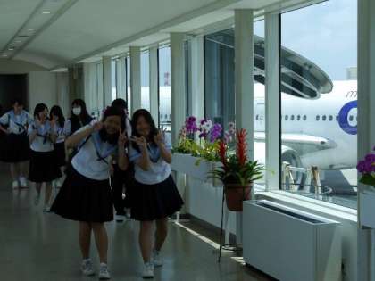 朝早くに集合したけれども、もうみんなのテンションはマックス状態。伊丹空港から那覇に1時間半ほどの旅を楽しみます。沖縄についたとたん、むわっとした空気に歓迎されました。