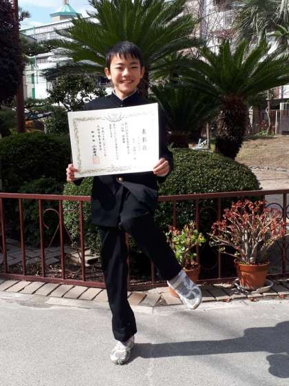 1年生の木下亜輝斗さんが、キックボクシングの全国大会で準優勝しました。その結果、教育長表彰を受けました。次回は優勝が目標で、キックボクシングのポーズで表彰状を手にしています。