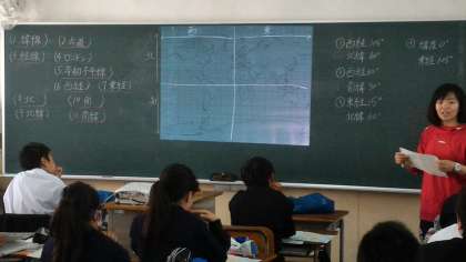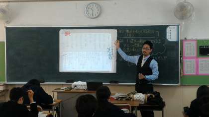 タブレットとプロジェクターを利用した社会科授業の様子です。映し出された映像に書き込みができます。