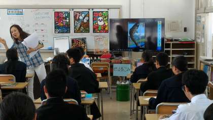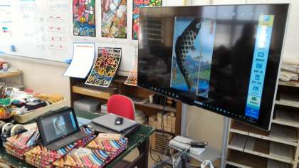 タブレットと60インチ大型テレビを活用した美術科授業の様子です。