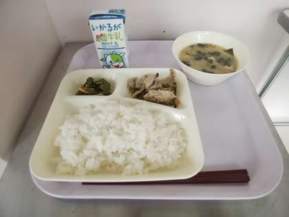 今日は豚肉の甘辛焼き、味噌汁、オクラのおかかいためです。