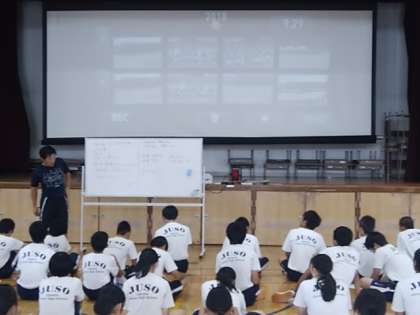 撮影したビデオ動画を見て、体育大会の振り返りをしています。
