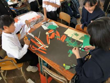 最初は要領をつかめずに苦労している班が多数でしたが、役割分担もできてきて、作品の形が少しずつできてきています。何の絵を作っているか、わかるでしょうか?完成を楽しみに・・・。