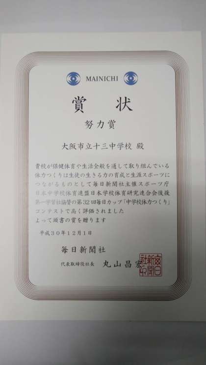 毎日新聞が主催する第32回毎日カップ「中学校体力つくり」コンテストにおいて本校の取り組みが評価され努力賞を受賞しました。全国1万1000校ある中学校のうち4147校がエントリーし、新体力テストの成績上位校94校の中から大阪府では唯一入賞しました。