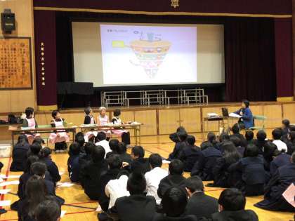 本日6時間目、1年生に向けて体育館で食育講話を行いました。