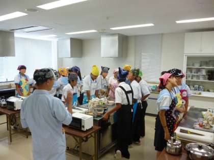 リーダーたちは朝食の大切さ、喫食のポイント、栄養バランスなどの説明を受けた後、「ツナマヨネーズパン」「パスタスープ」「海鮮サラダ」を教えてもらいながら料理しました。作った朝食を食べて感想などをまとめました。さすがリーダーたち、調理作業はスムーズに進み、料理もおいしかったです。簡単なレシピだったのでみんなにも広めてほしいと思います。