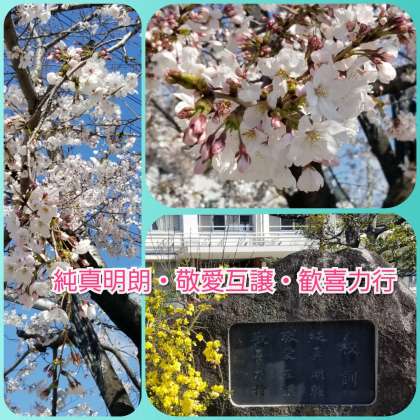 校門の桜にはつぼみも見られますが、明日は鮮やかに開花した桜がお迎えします。