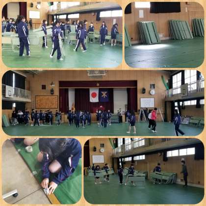 式場になる体育館では、新2年生がシートを敷き椅子を並べていきます。