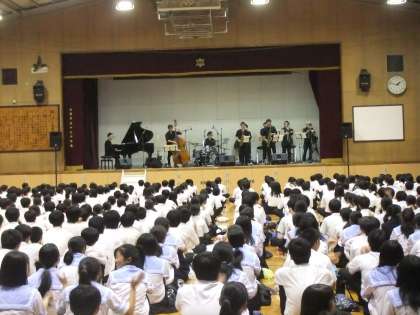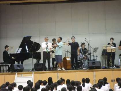 今年度は、音楽鑑賞(JAZZ演奏)でした。JAZZでは、曲途中のアレンジソロが醍醐味だそうです。「イン・ザ・ムード」の演奏で始まり、「シング・シング・シング」「A列車で行こう」と続きました。そして、「上を向いて歩こう」や「世界に一つだけの花」、ジブリのメドレーなど、みんなも知っている曲をたくさん演奏していただきました。途中、校長先生や1年担当の先生が舞台に上がり、歌を熱唱し、大きな拍手に包まれました。