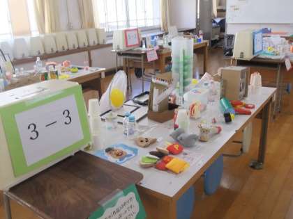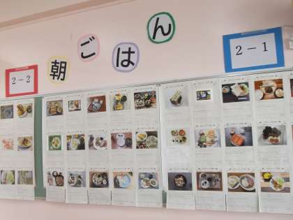 同じく、左の写真は2年生家庭科の朝ごはんレポート、右は3年生家庭科の幼児の手作りおもちゃです。