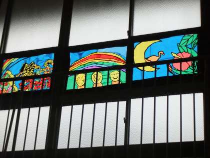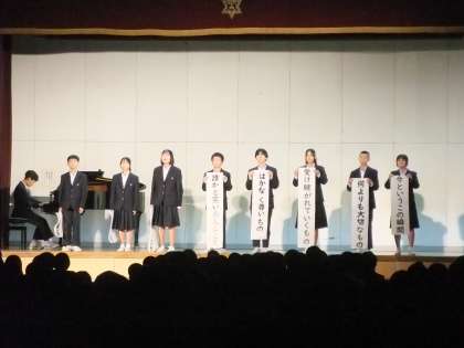 写真は2年生の取り組みの様子です。2年生は映像作品あり、詩の朗読あり、ダンスありでした。また、ステンドグラスの作品も披露されました。