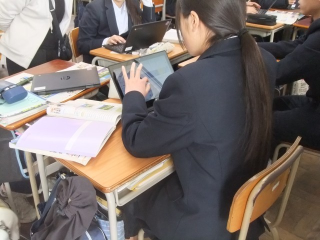 また、後半は、班ごとで「観光ルートPRゲーム」をして、内容を深めました。タブレット端末を使い、道北・道東・道央・道南の4つの地域から1つを選択し、修学旅行で7時間の自由時間があったとしたら、どの地域をどのようなコースで観光するかを相談し、発表を行いました。そして最後には「なぜ北海道は観光業が盛んなのか」を考え、まとめました。