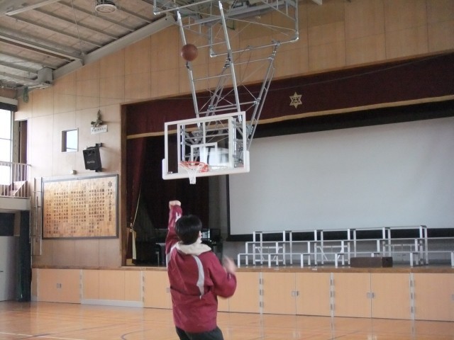 早速、男子バスケットボール部の顧問の先生が、新しいゴールに向かってシュートを放っていました。