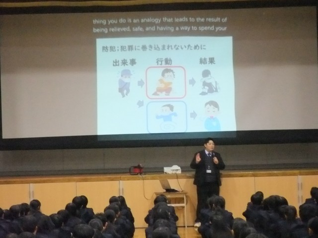 剣道部の表彰の後、生活指導担当の先生からは防犯についてのお話がありました。春季休業中に犯罪に巻き込まれないためには、不審者に遭遇したときはとにかくその場から「逃げる」こと。そして、警察や身近な大人に申告・相談をするようにしてください。