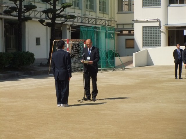 本日より、1学期がスタートしました。Meetを使ったオンラインでの始業式では学校長より講話、生活指導担当から生活面でのルールの再確認等を行いました。着任式では、新転任の先生から一言ご挨拶がありました。その後、グラウンドに移動して、対面式、生徒会長の認証式を行いました。