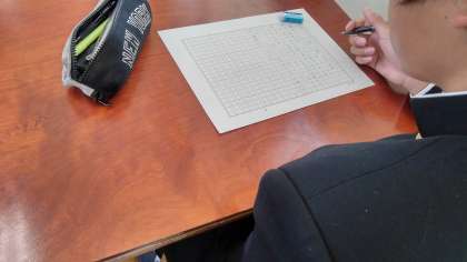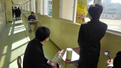 廊下で視力検査、裏番組で作文「3年生になって」に取り組んでいます。