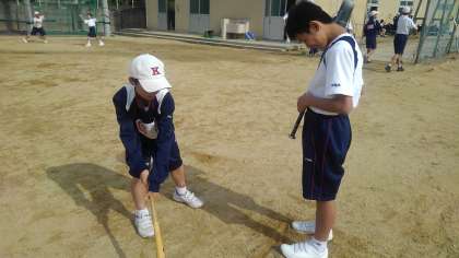 丁寧に一人が一人の1年生に素振りを指導しています。
