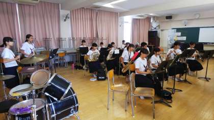 1年生はたそがれコンサートに向けてラデツキー行進曲を練習しています。テンポよく吹くために、まずはゆっくりのテンポでしっかり合わせる練習です。
