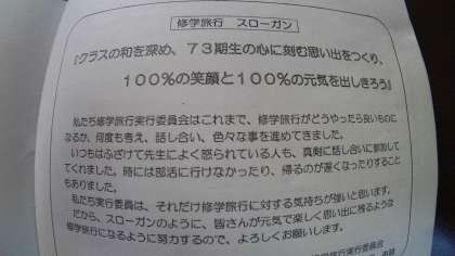 だから、スローガンのように、皆さんが元気で楽しい思い出に残るような修学旅行になるように努力するので、よろしくお願いします。