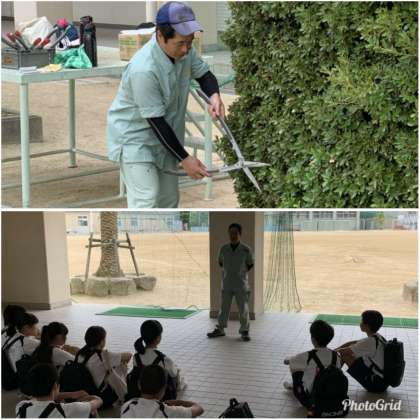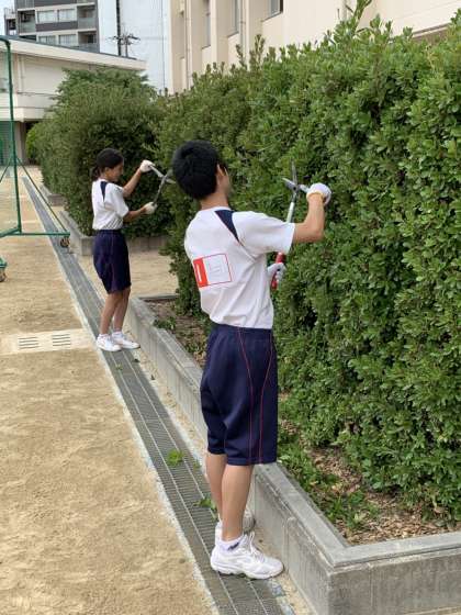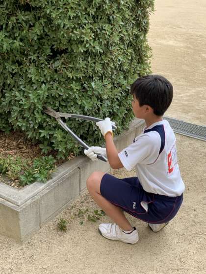 管理作業員さんから説明をうけて、グランドの生垣の剪定作業を行っています。