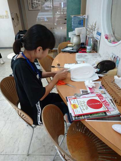 美容室での職場体験。パーマ液の調合やパーマをするときのガーゼを作っています。