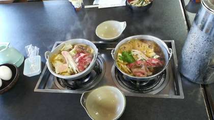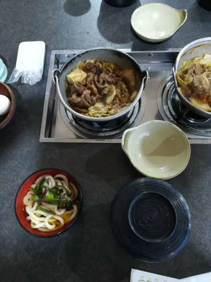 昼食の牛すきやき膳です。到着時間に合わせて加熱されています