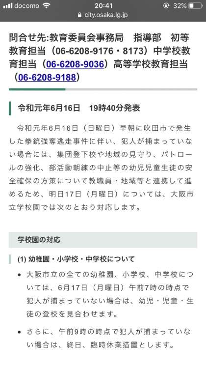 大阪市立の全ての幼稚園、小学校、中学校については、6月17日(月曜日)午前7時の時点で犯人が捕まっていない場合は、幼児・児童・生徒の登校を見合わせます。
