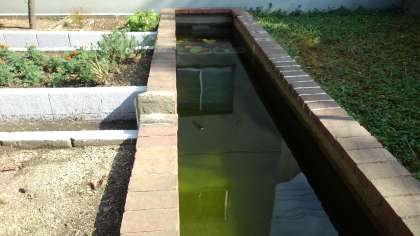 小さな池はアオコで緑色ですが、水は綺麗に保たれ、鯉、金魚、めだかたち元気に泳いでいます。