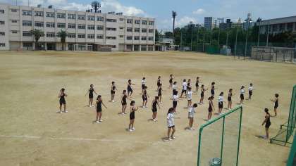 男子はプールサイド、女子はグランドにてラジオ体操と補強運動を行います。
